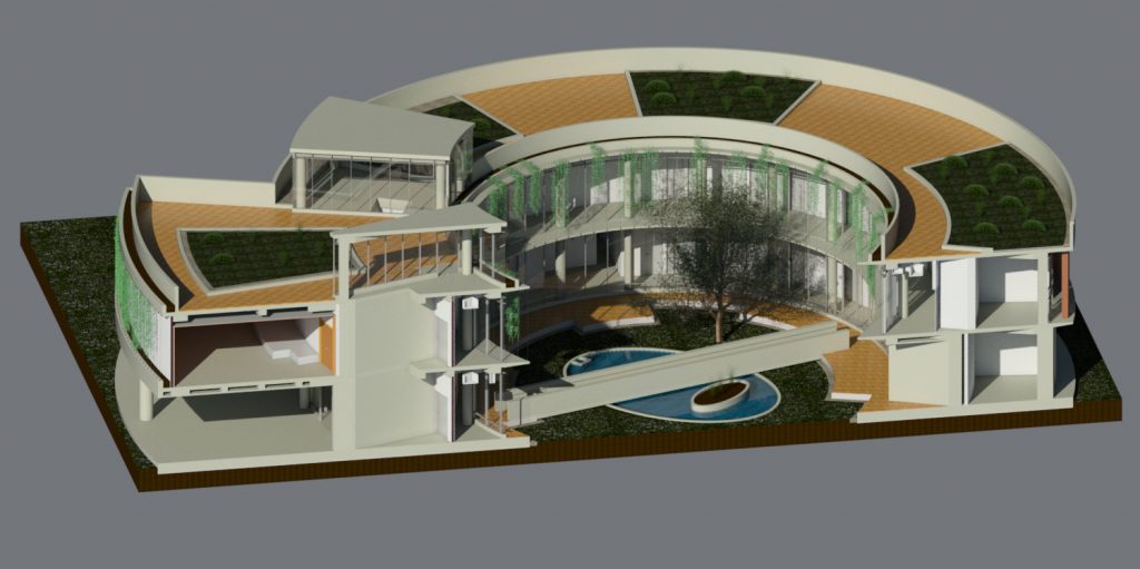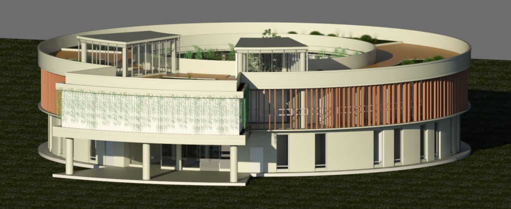 La visión de esta representativa construcción es mostrar el consumo del agua que ha sido tratada en la planta, siendo este el principal motivo de su forma y función. El agua será utilizada tanto en los baños ubicados en el interior como en el riego de las plantas que el edificio albergará.